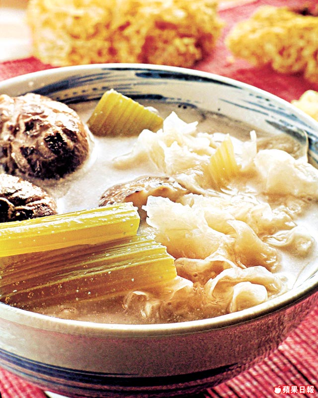3. 將薑、銀耳、冬菇、西芹、椰汁及水放入煲中,先以大火煮滾 10分鐘,轉小火煲 2小時,加入鹽調味即可。