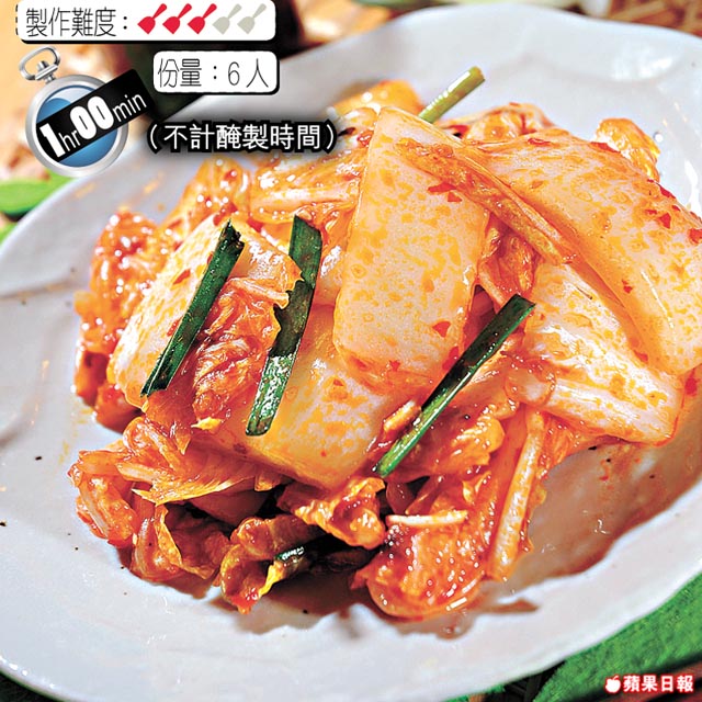 1.用手剝開大白菜葉,切成小塊,加幼鹽拌勻,置室溫30分鐘,瀝水。