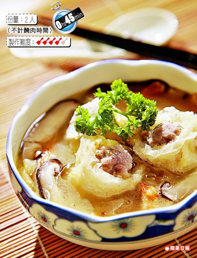 魚肚湯不一定是以粟米羹的形式宴客的,花點心思,將醃好的冬菜豬肉釀入魚肚中,令湯羹更得體更美觀。加上用冬菇和蝦乾提味,令魚肚吸盡蝦鮮,吃起來味道更豐富。