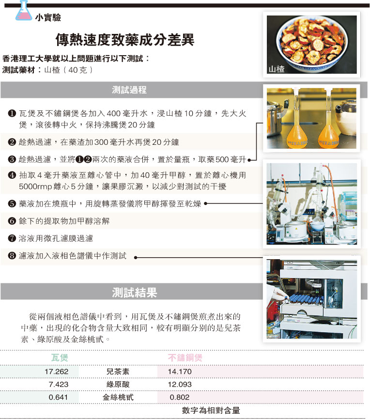 莫錦華博士估計,「不鏽鋼煲傳熱比瓦煲快,煎煮過程或破壞了某些化學成分,所以瓦煲的兒茶素含量多些。至於綠原酸和金絲桃含量,不鏽鋼煲比瓦煲多,原因難以一概而論。因為煲藥是一個很複雜的化學反應,當中受很多因素影響。不同藥材有不同的化學成分,每種成分對身體也有不同功效,難以斷定用哪種煲較好,但實驗證明,兩者煎煮出來的藥液的確有分別,雖則差距不是很大」。