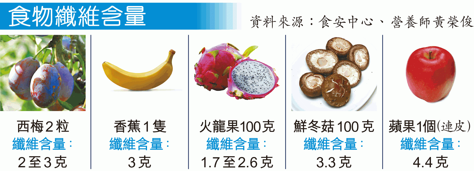 【蘋果日報】要改善便秘,宜從飲食入手。資深營養師黃榮俊表示,成人每日應攝取20克以上的纖維素,若要針對腸道健康,應增加非水溶性纖維吸收,因非水溶性纖維能幫助腸道蠕動,令大便較軟且量較多,較易將廢物排出體外舒緩便秘,西梅、紅米糙米及燕麥均含豐富非水溶性纖維。