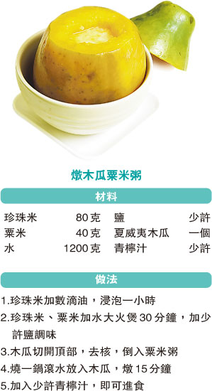 「病人常問,聲沙食什麼好,我覺得木瓜最有根據,因為治療聲沙的藥物,其中一個成分來自木瓜酵素,所以今日教大家煮燉木瓜粟米粥。」鄭醫生教路,預先煲好的粟米粥,要濃稠一點,因為放入木瓜燉煮時,木瓜會滲出汁液,令粥變甜。