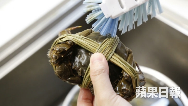 聞說要洗蟹,相信女士們隨即會耍手擰頭,怕骯髒之餘,更怕是蟹腳蟹箝鋒利無比。其實洗蟹非常容易,只要記住這五大位便可,包括浸蟹,洗蟹肚、蟹爪、蟹殼及蟹箝上的毛,「浸清水約10分鐘,讓牠將體內的不潔水份及液體吐出來。蟹箝的毛一定要洗,它藏了很多微生物及泥,要清洗得很乾淨。」尹師傅還說,洗過的蟹必定要在當日吃完,因為香港的水並非飲用水,含有大量氯氣,大閘蟹遇水後很快會死亡。