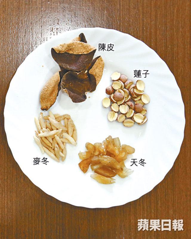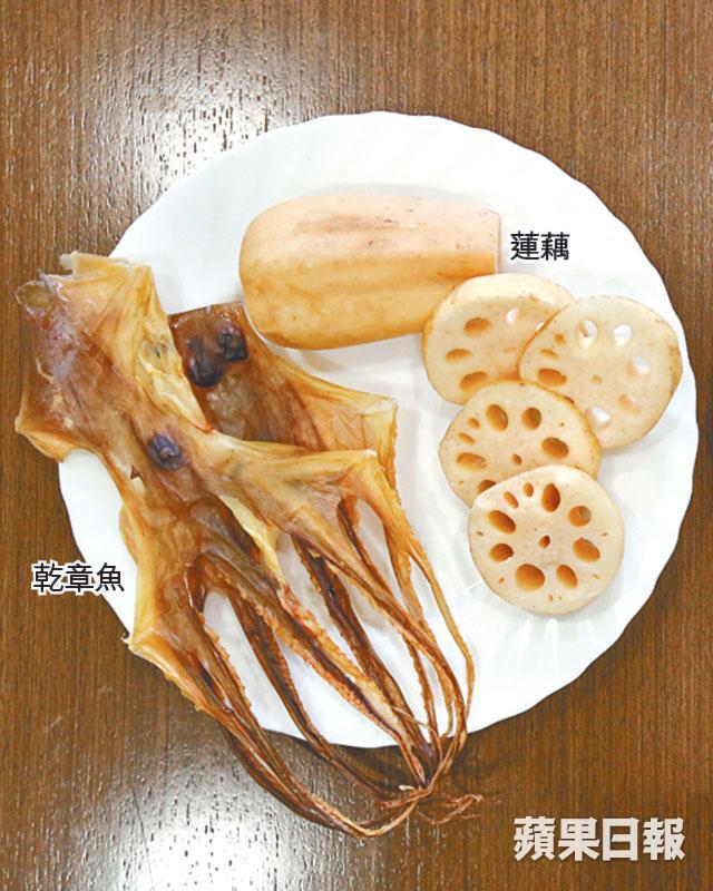 材料:麥冬、天冬及蓮子各15克、陳皮9克、蓮藕兩節、乾章魚1片