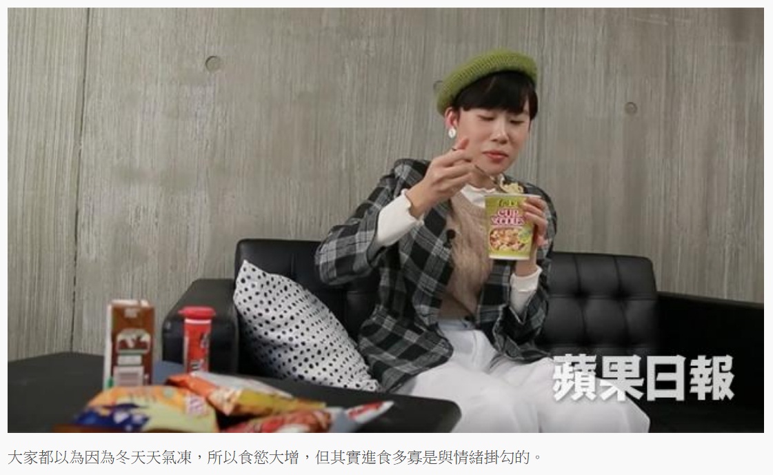 營養師吳耀芬表示,外國有不少研究指出,天氣冷對於進食的食量是沒有直接影響,但因為冬天日照時間較短,很易令人覺得憂鬱,所以會吃更多食物令自己開心,這個現象稱為「季節性情緒失調」,亦稱為「冬季憂鬱症」,會讓人失去了體重管理的意識。心理學家陳志豪亦指出,我們冬天想進食只是一個藉口,因為天氣寒冷而多吃是一個錯誤觀念,進食和情緒是掛勾的,冬天不開心很正常,因為大家不會常常做運動,做運動就會令人開心,絕不是因為天氣寒冷而要進食,正如有些人到雪地行山,亦不會帶同很多食物。
