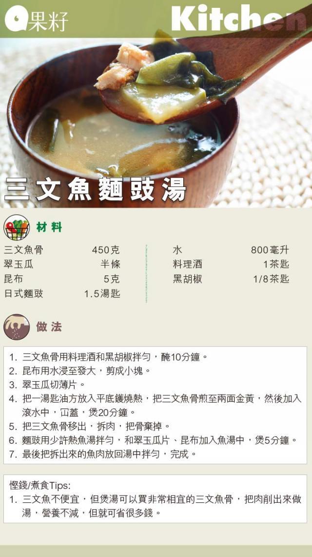 夜晚想食住家飯煮幾味,但又不想放工趕買餸?好好利用假期買定急凍肉類和耐放的蔬菜,放工直接回家下廚,同家人分享窩心又營養豐富的晚餐,完全無難度。急凍的肉類,早上出門前放在雪櫃下格,晚上回家便可直接處理了。今次米太會示範用便宜又有益的急凍鯖魚和三文魚骨;一些耐放的蔬菜如青瓜、翠玉瓜、甘筍;雪櫃常備的食材如雞蛋、火腿和昆布,來做一頓經濟又簡易的和風晚餐──三文魚麵豉湯、薯仔沙律、鹽燒鯖魚,為自己和家人打打氣。