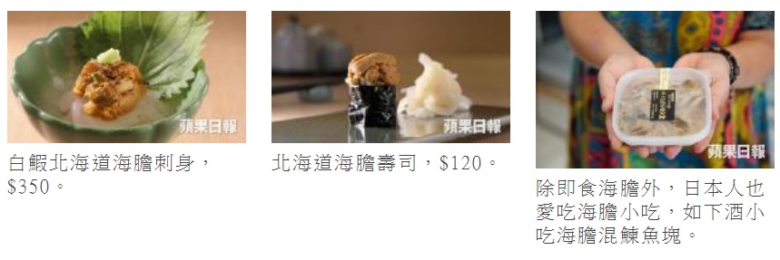 日本海膽種類多,在香港常見的品種包括馬糞海膽、蝦夷馬糞海膽、紫海膽和北紫海膽。