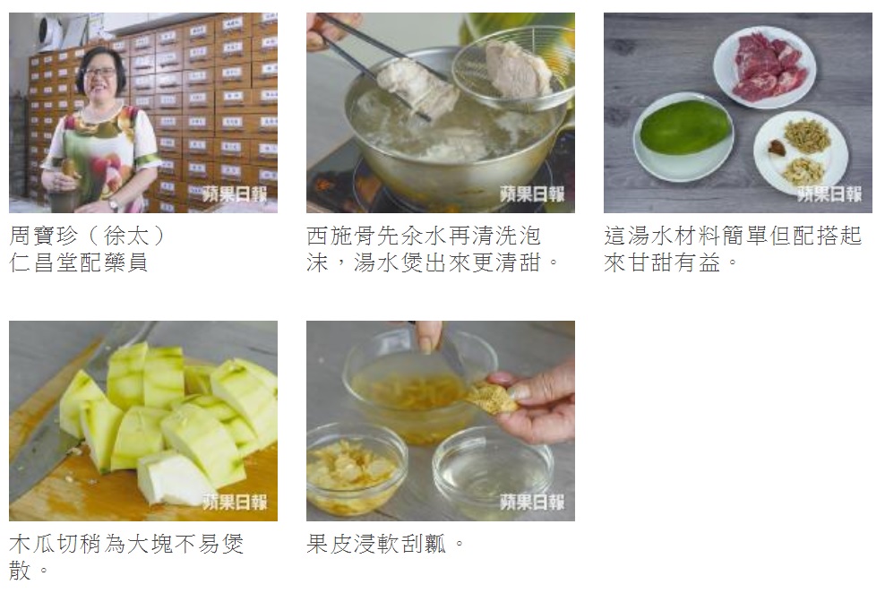 徐太本身有20年中醫診所配藥經驗,加上兒子和丈夫也同是中醫師,全家都對養生食療特別留意。來到立秋節氣(昨日),徐太這次要分享一個合時的花旗參木瓜豬骨湯。「立秋代表秋天將來臨,但香港的天氣仍比較悶熱,所以今次推介的湯水會有清熱潤燥作用。」花旗參有補氣養陰,清熱生津的功效。晚睡,以及經常吃熱氣煎炸食品致口乾的人尤其適合飲這湯。清甜的木瓜,正好可以中和花旗參的甘味,配用西施骨除了令湯水清而不油,肉也特別腍,飲湯連湯料同吃也一樣好味。徐太提提大家,木瓜要選菜檔的青皮本地木瓜,生木瓜煲湯較清,想更香甜則可選稍熟的,各有不同風味。