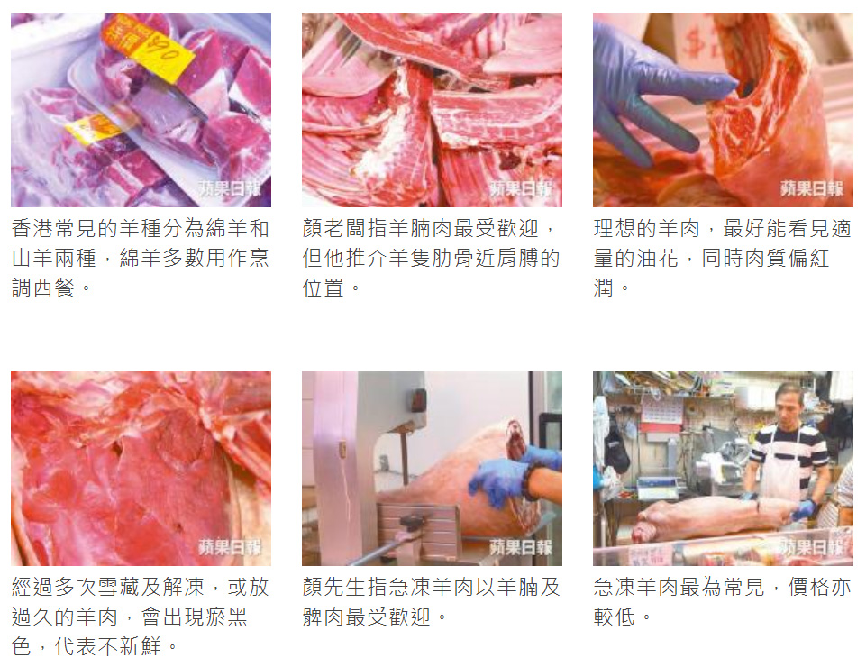 「頂好肉檔」的老闆顏先生,從事凍肉生意多年,對進口羊肉尤其熟悉。他說:「香港進口的綿羊肉大多來自澳洲及新西蘭;而山羊肉則由蒙古、新疆和河北等大陸城市進口為主。」綿羊的肉質較鬆軟,但羊羶味較淡。相反,山羊的肉質較緊致嫩滑,羶味較重。與綿羊肉相比,山羊肉較受中國人歡迎,通常用來煮羊腩煲和羊肉串燒等菜式。顏老闆指,除羊種外,羊隻的年紀亦會影響肉質。一歲大的成年羊最適合食用,皆因肉質嫩韌和羊羶味適中,食客較易接受。相反,飼養不足一年的幼羊,羊羶味過淡,加上不夠肥大,多數會如乳豬一樣整隻入爐烤製食用。顏老闆提醒,兩歲以上的老年羊或曾生育過的母羊,肉質較粗韌,羊羶味亦較濃烈,市民應避免選擇。