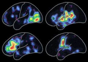 左圖所顯示的陽電子釋放 X 線斷層掃瞄(PET scan)顯示不同腦部活動的模式: