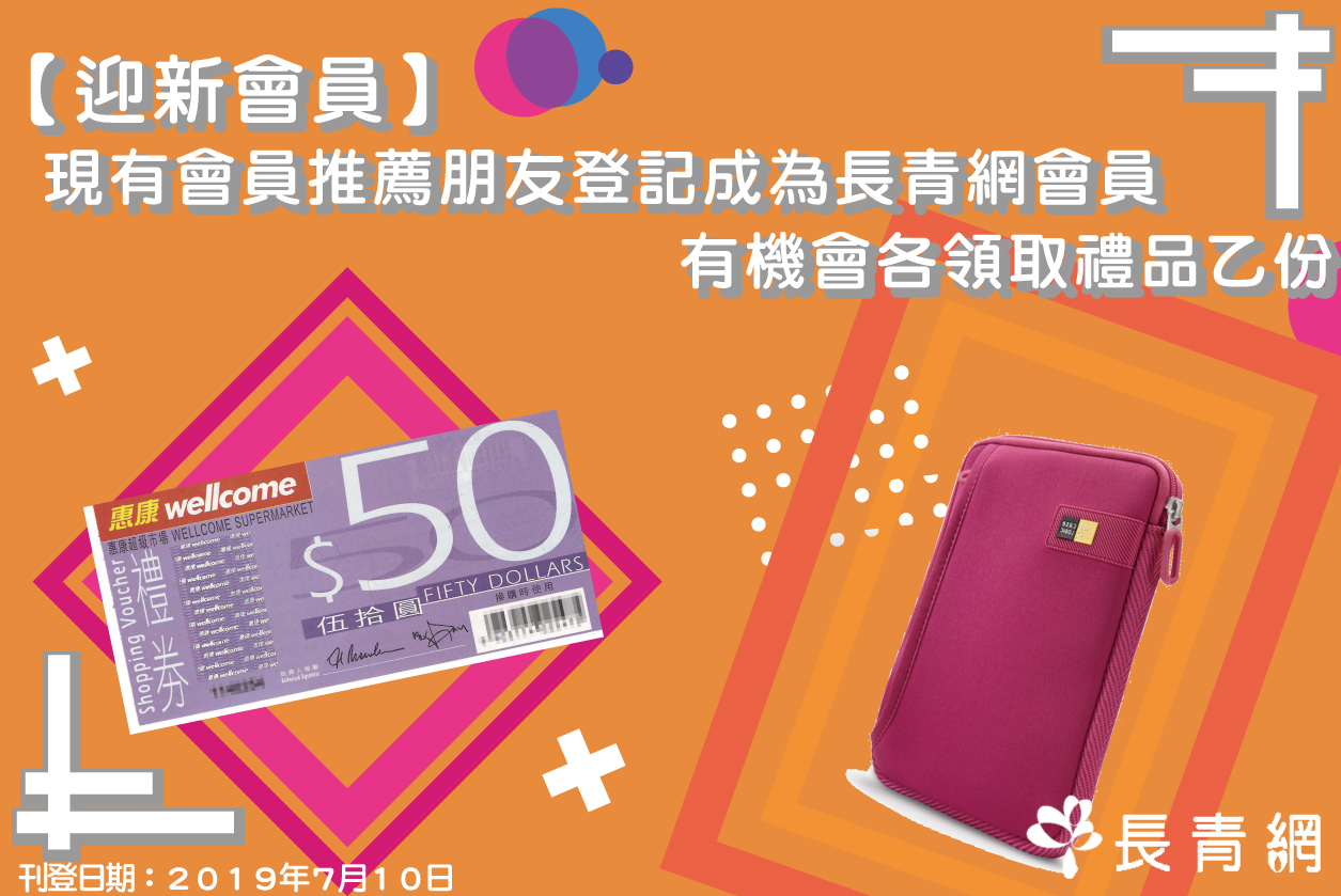 全新長青網煥發嶄新面貌!為慶祝長青網新版面世,即日起至2019年08月23日期間,現有會員推薦10位親友登記成為長青網會員,即有機會領取50元惠康現金券乙張(名額20個); 而首次登記成為長青網會員,亦可領取迎新禮品Case Logic平板電腦保護套乙個(名額200個)!