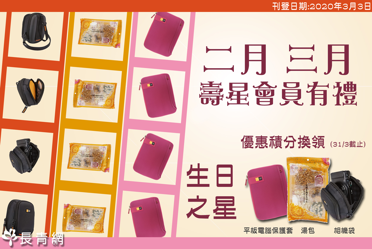 2月及3月壽星會員請注意!如果你是2月或3月生日,即可以優惠積分領取優質實用生日禮物 — 花旗蔘蟲草花湯包乙包 或 Case Logic相機袋乙個 或 Case Logic 7寸平板電腦保護套乙個。