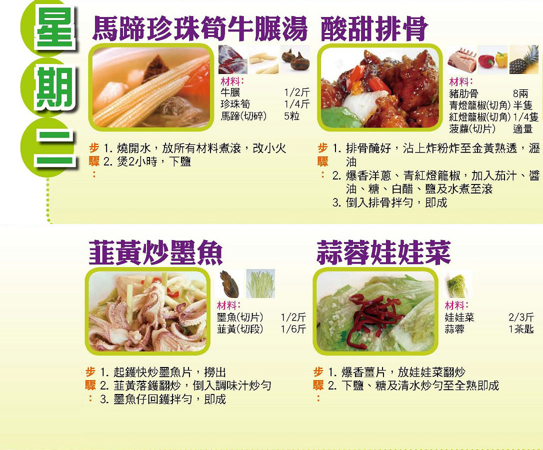 星期二 馬蹄珍珠筍牛展湯 酸甜排骨 韮黃炒墨魚仔 蒜蓉娃娃菜 |