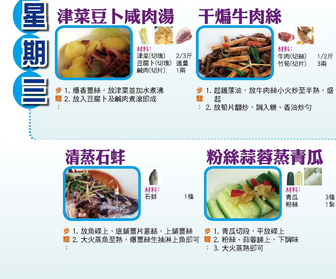 星期三 津菜豆卜咸肉湯 干煸牛肉絲 清蒸石蚌 粉絲蒜蓉蒸青瓜 |