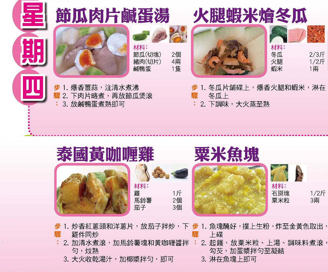 | 星期四 節瓜肉片鹹蛋湯 火腿蝦米燴冬瓜 泰國黃咖喱雞 粟米魚 |