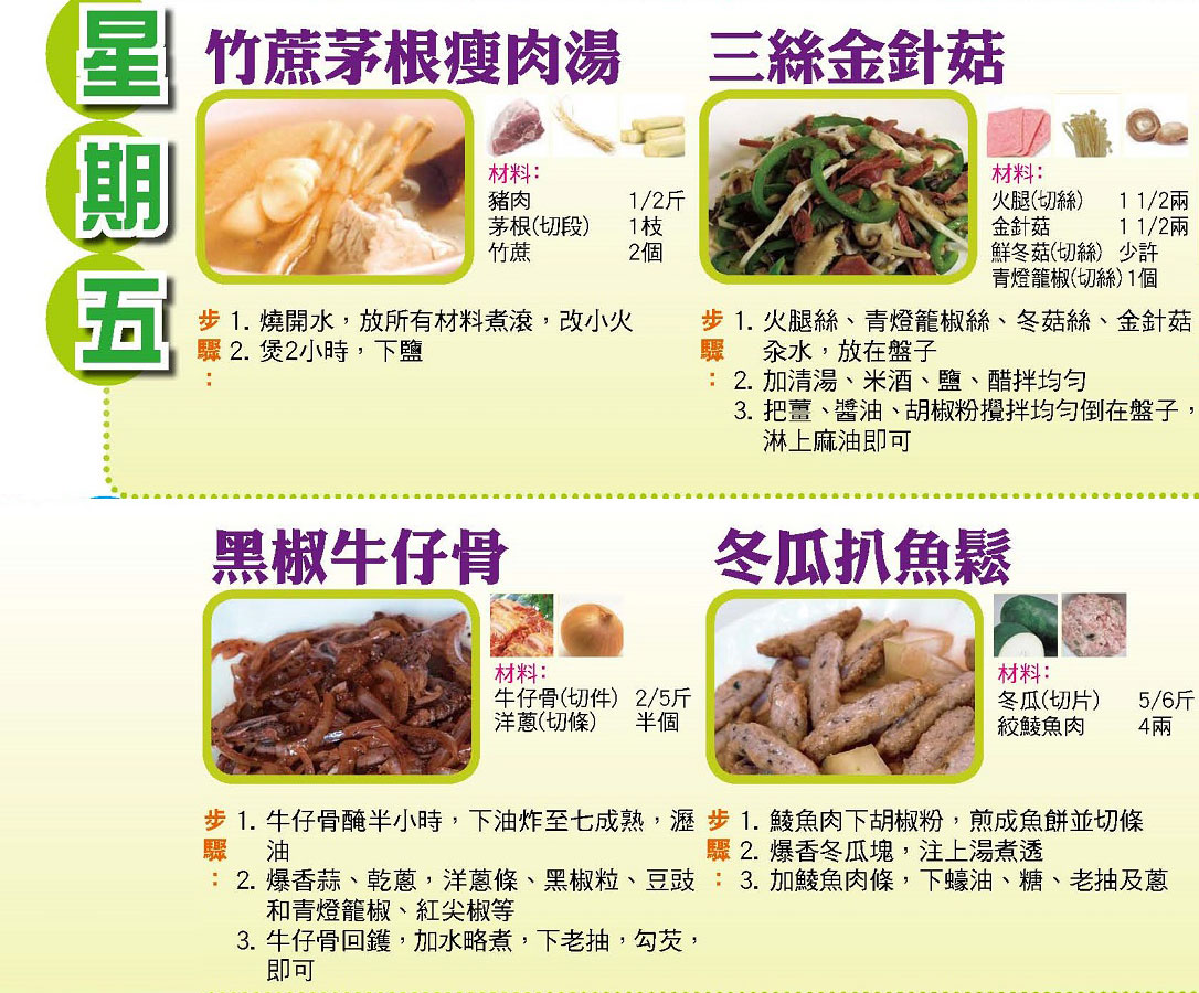 星期五 竹蔗茅根瘦肉湯 三絲金針菇 黑椒牛仔骨 冬瓜扒魚鬆 |