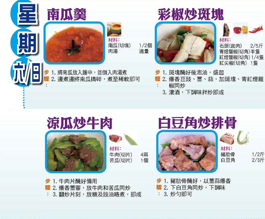星期六/日 南瓜羹 彩椒炒斑塊 涼瓜炒牛肉 白豆角炒排骨 |