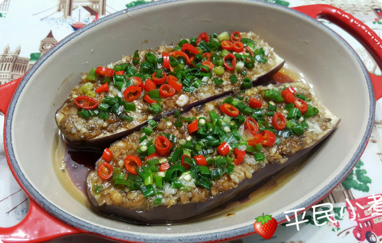 隔水蒸茄子大約10分鐘。灑上蔥粒和紅椒粒作裝飾。麻油煮滾,淋在茄子上,加上甜醬油即成。