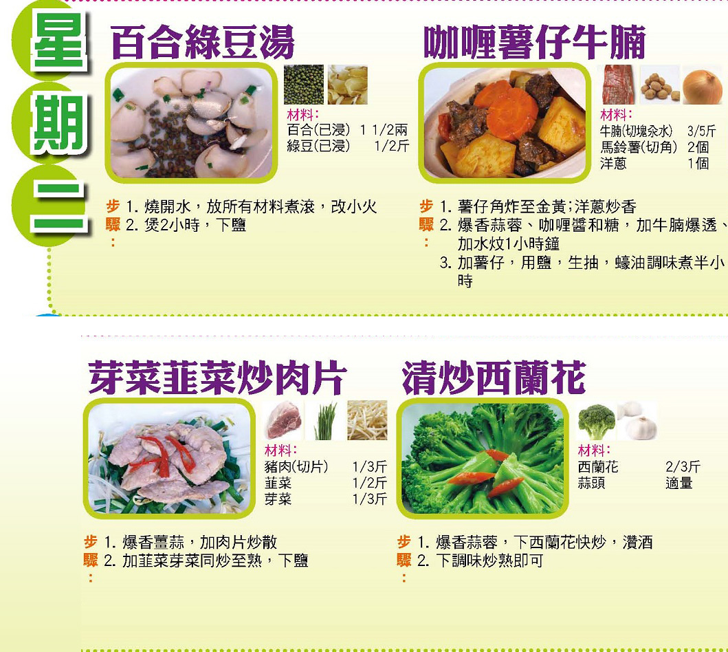 星期二 百合綠豆湯 咖喱薯仔牛腩 芽菜韮菜炒肉片 清炒西蘭花 |