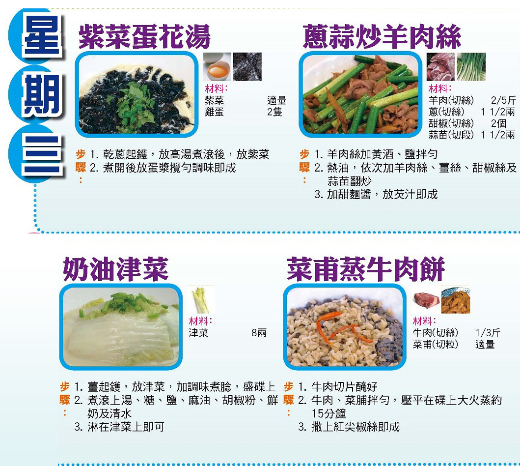 星期三 紫菜蛋花湯 蔥蒜炒羊肉絲 奶油津菜 菜甫蒸牛肉餅 |