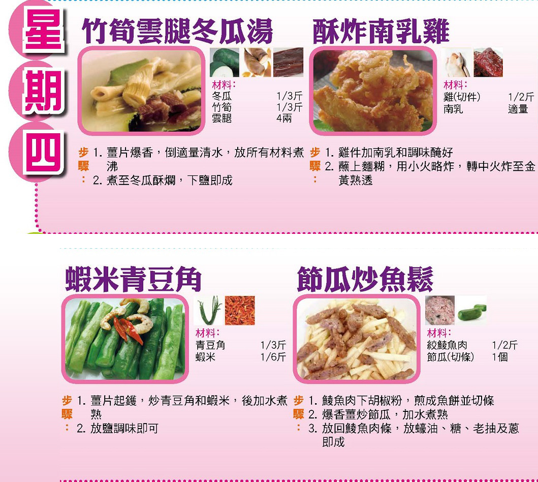 | 星期四 竹筍雲腿冬瓜湯 酥炸南乳雞 蝦米青豆角 節瓜炒魚鬆 |
