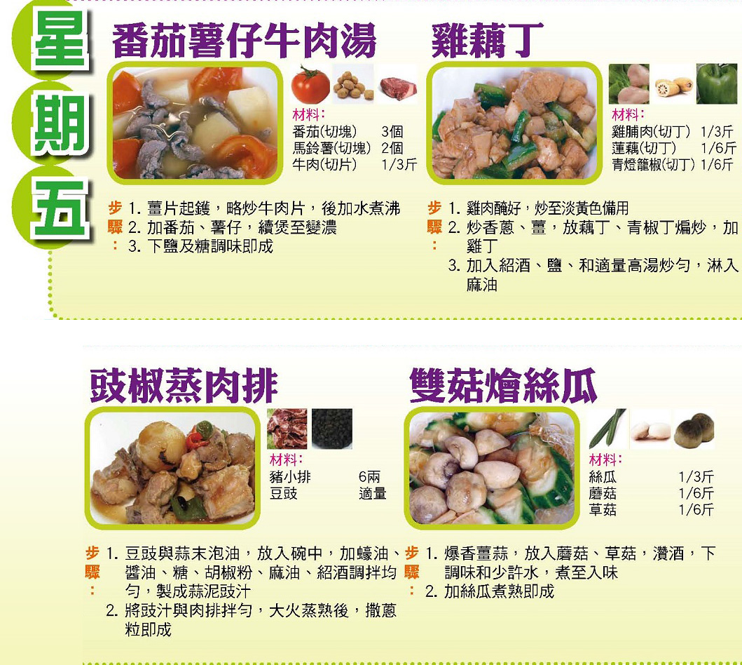 星期五 番茄薯仔牛肉湯 雞藕丁 豉椒蒸肉排 雙菇燴絲瓜 |