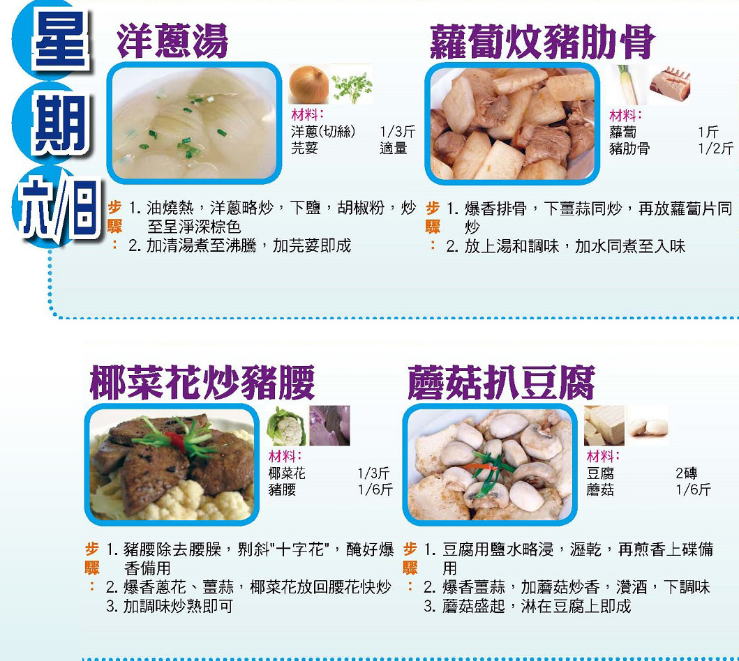 星期六/日 洋蔥湯 蘿蔔炆豬肋骨 椰菜花炒豬腰 蘑菇扒豆腐 |
