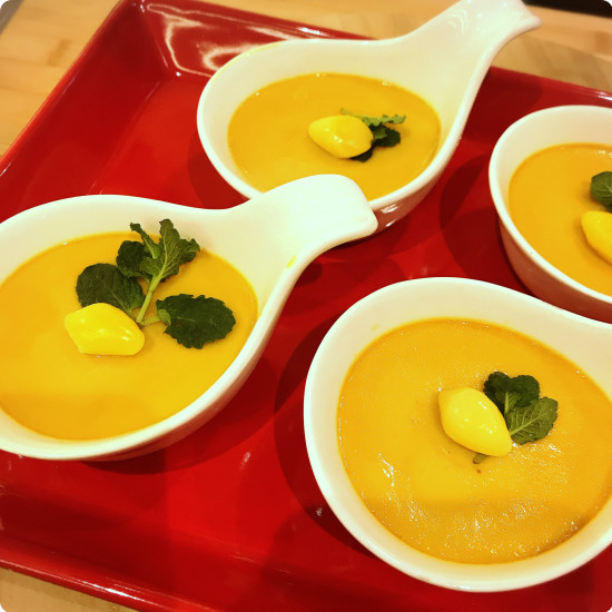 把蛋液平均地倒入小碗中,包上保鮮紙蒸15分鐘。最後加上銀杏和薄荷葉。