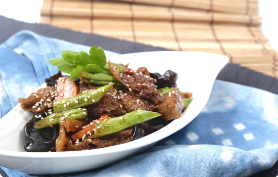 第3步:大火燒熱鑊,下少許油爆香薑片,加入烤麩及調味料煮至汁料滾起。調中小火加蓋炆約5分鐘。最後加入木耳、四季豆及甘筍片煮約5分鐘,調味汁煮至濃稠即成。
