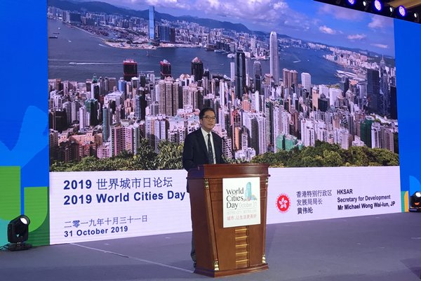 分享經驗: 黃偉綸在2019世界城市日論壇分享香港尋求城市轉型和突破的經驗。