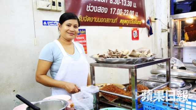 隨Sine來到本地人很喜歡的Samyan Market,街市格局跟香港竟有幾分相似,最驚喜是上到二樓,發現了跟香港相像的熟食中心,有各式各樣似足大牌檔的泰式餐廳。Sine第一站帶我去食附近大學生摯愛的「衞星雜扒餐」,翻開字典般厚的menu,單是不同組合的扒餐也有幾十種,看相片仍不以為意,以為個碟大極有限,當阿姐捧上比兩個人頭更大的「浴盆級」料理時,我嚇到下巴也差點掉下來,「這種份量,該怎樣吃?」 「我不是住曼谷,但每次來也會吃,因為真的好好味。」除了個碟驚人般大,其實賣相不是特別討好,只是不同做法的肉類放在一起:秘製醬汁芝士豬扒、芝士流心雞扒、薄煎牛扒、薄煎豬扒、中間的是茄汁意粉,旁邊的沙律菜、蘿蔔條份量也不少,另附上多士和薯條,跟Sine一起逐件試食,嘩,有料到!意粉很有香港八、九十年代冰室的雜扒意粉感覺,醬汁較甜但麵條煙韌入味。厚切炸雞扒以為是很厚粉那種,點知皮薄脆又香酥,雞肉嫩滑,裏面竟然包了火腿和芝士。找來老闆問個詳細,「當然滑啦。店家先用獨家醬料醃製兩至三小時,放入冰格雪八小時,把芝士放進雞扒再沾上麵包糠,一放進滾油中就收細火,火喉要控制得很好,讓肉塊慢慢由外到內熟透,剛好鎖住肉汁和保持肉質嫩滑。全泰國我想只有我們這家咁樣做。」泰式快餐,不只得個大字,用料足之餘,每份也即叫即製,一大份足夠四個人share,只係八十多港元,夠草根,抵玩!
